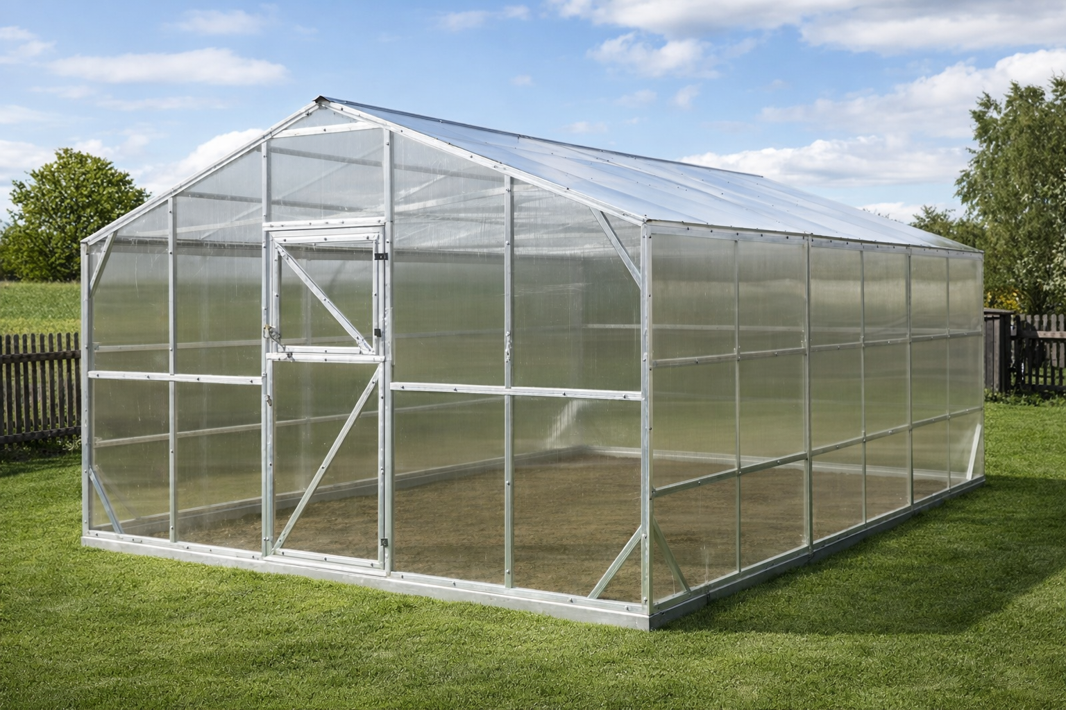 Poliwęglan o grubości 4 lub 6 mm z ochroną przed śniegiem i promieniowaniem UV, dwoje drzwi i dwoje okien do wentylacji.